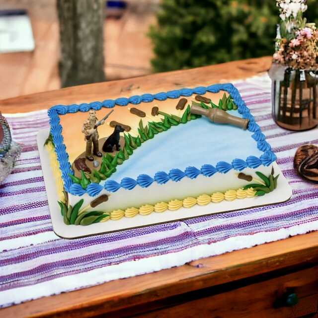Introducing our Duck Hunter Father's Day Cake, the perfect tribute to the outdoor enthusiast dad! This cake features a charming hunting scene, complete with a dad, loyal hunting dog, and duck call, all beautifully crafted atop the cake. Whether Dad enjoys spending his days in the great outdoors or has a passion for hunting, this cake is sure to bring a smile to his face on Father's Day. With its detailed design and delicious flavor, our Duck Hunter Father's Day Cake is the ideal centerpiece for celebrating Dad's special day. Treat him to a sweet surprise that captures his love for hunting and the great outdoors!